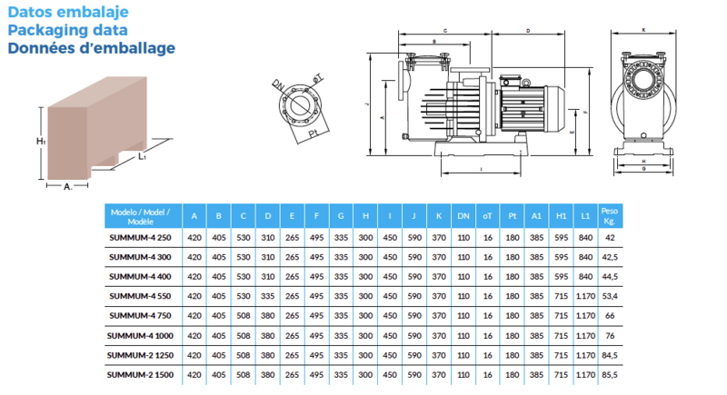 هذه مضخة ذاتية الشفط ذات حجم كبير تعمل بصمت بفضل محركها بأربعة أقطاب. وهي متاحة بإصدارين بأربعة واثنين من الأقطاب، مما يجعلها مثالية لأنظمة الترشيح الأكبر. تتميز المضخة بوجود فلتر مسبق ضخم على جانب الشفط، مع غطاء بولي كربونات لمشاهدة سهلة لمحتويات سلة فلتر مسبق. وتتألف علبة الفلتر المسبق، علبة المضخة، الطلمبة، الطلمبة العكسية، والغطاء من بولي بروبيلين محمل بألياف الزجاج، مقاوم للمواد الكيميائية الموجودة في حمامات السباحة. وتتكون سلة فلتر مسبق من البوليثين، وتحتوي الغطاء على نظام إغلاق من أربعة أعمدة. وتتكون الدفاعة من مادة نوريل، والختم الميكانيكي من الكربون السيراميك والفولاذ المقاوم للصدأ AISI-316. وتتكون البراغي من الفولاذ المقاوم للصدأ AISI-316، ويتكون العمود من الفولاذ المقاوم للصدأ AISI-316 أيضًا. وتحتوي المضخة على وصلات قياسية.